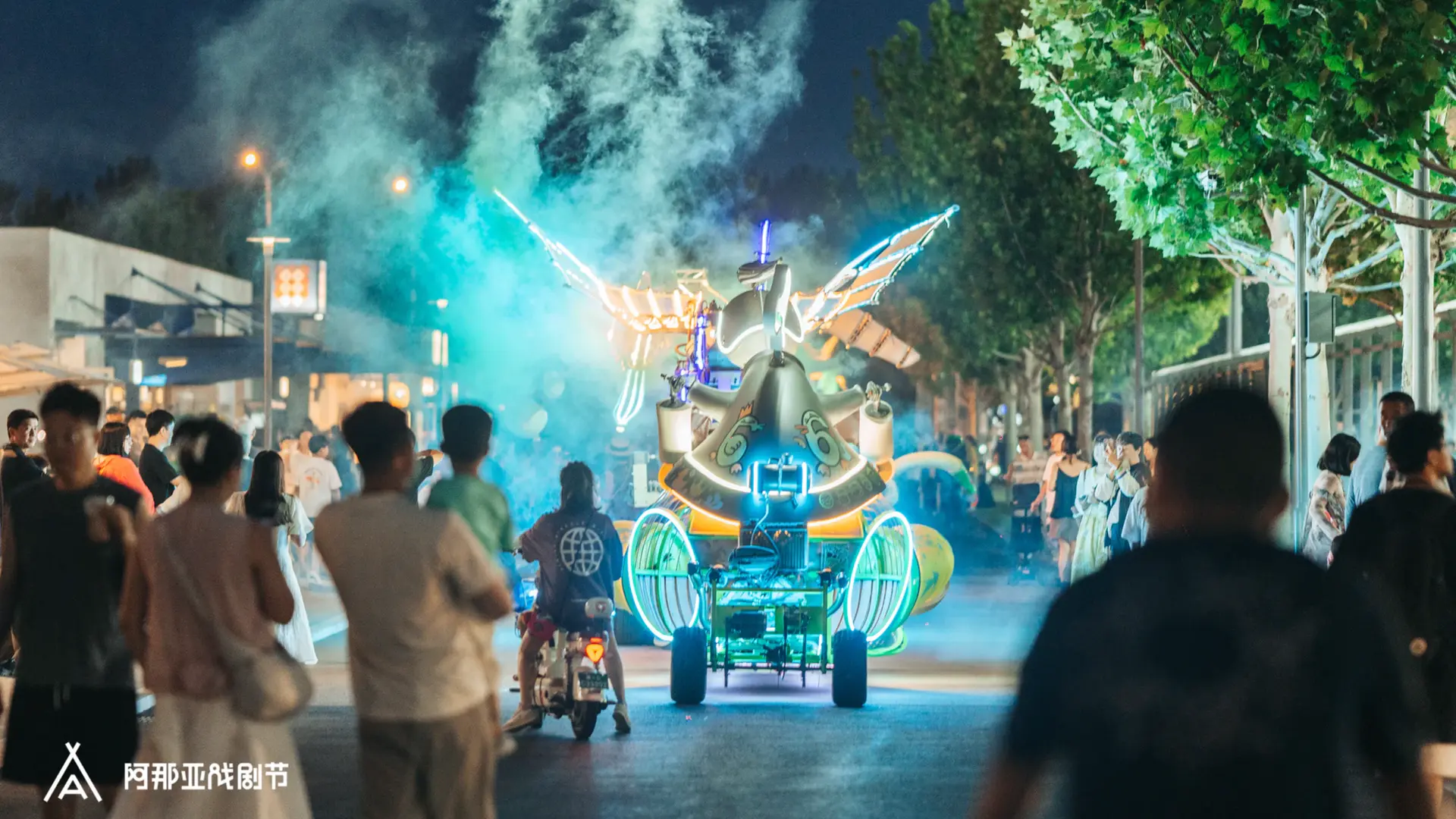 巡游队伍由来自“候鸟300”的跨领域艺术家群体担当主力,以无界创意构建出一支流动的装置艺术舰队。 当表演艺术家们在行进中即兴展开融肢体、声音与光影为一体的多元路演时,装置艺术家则以“移动展场”的概念不断将作品解构重组,将巡游车辆转化为动态的艺术载体。 这场如海边迁徙般的创作实践,始终保持着未完成的生长状态——金属结构的碰撞重组、织物的即兴缠绕、涂鸦的随机蔓延,所有元素在行进轨迹中持续发酵。 艺术家们通过这种“正在发生”的创作语法,让阿那亚的海风与星光也成为作品的变量,以实时演进的在地性创作,书写出一部鲜活的艺术启示录。